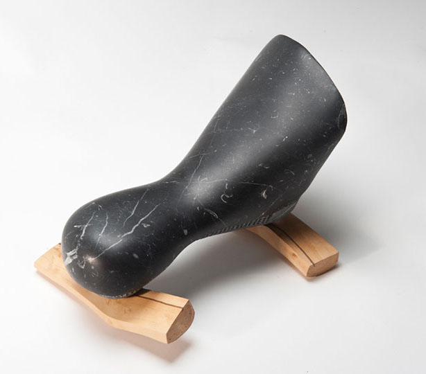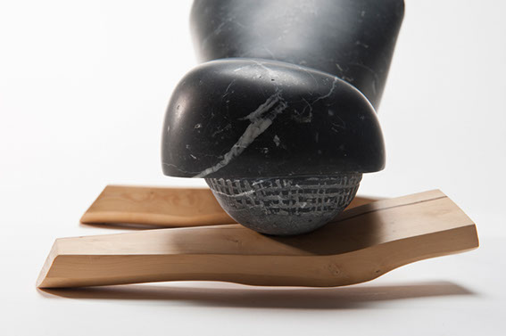 BALENA Mides: 35x20x20 cm Aquesta és una peça realitzada amb marbre de Marquina, un marbre negre del País Basc. Està suportada per dos fragments de fusta de boix treballat que afegeixen un contrast cromàtic i de material. L’acabat de la pedra li dóna un aspecte semblant a la pell molla d’un cetaci.