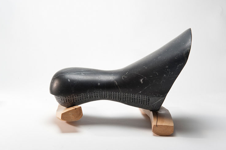 BALENA Mides: 35x20x20 cm Aquesta és una peça realitzada amb marbre de Marquina, un marbre negre del País Basc. Està suportada per dos fragments de fusta de boix treballat que afegeixen un contrast cromàtic i de material. L’acabat de la pedra li dóna un aspecte semblant a la pell molla d’un cetaci.